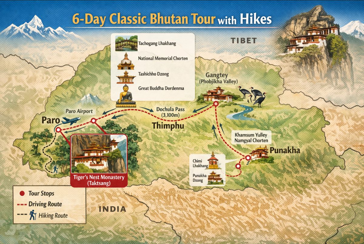 Step into the mystical Kingdom of Bhutan on this immersive 6-day journey, a perfect introduction to the Himalayan kingdom’s rich culture, spiritual heritage, and breathtaking landscapes. This thoughtfully curated itinerary takes you through Thimphu, Gangtey (Phobjikha Valley), Punakha, and Paro, blending majestic dzongs, ancient monasteries, scenic valleys, and authentic cultural encounters.